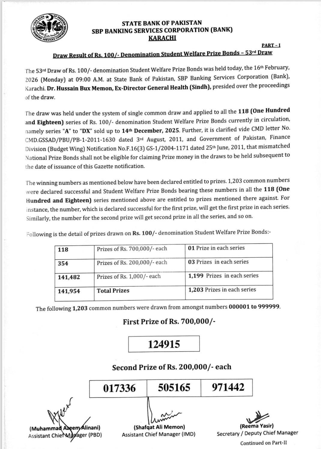 🏆 100 Prize Bond Draw #53 Result – Karachi (16 Feb 2026)