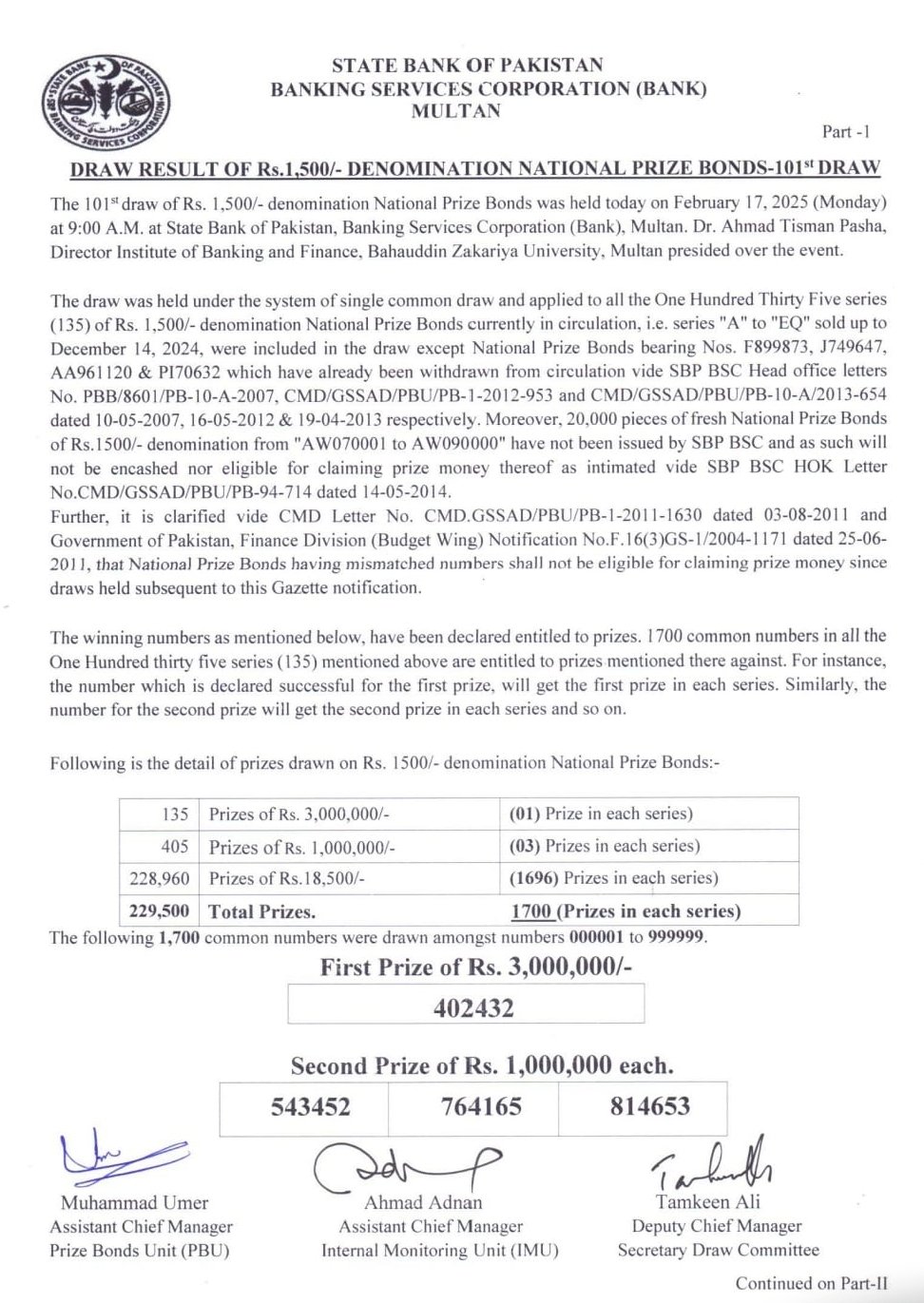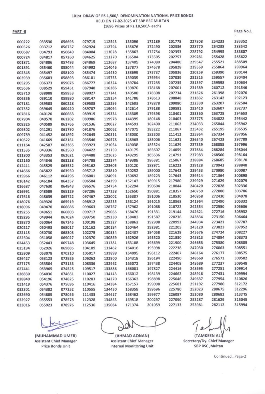1500 prize bond draw list 2025, Draw No. 101, February 17, 2025, Multan