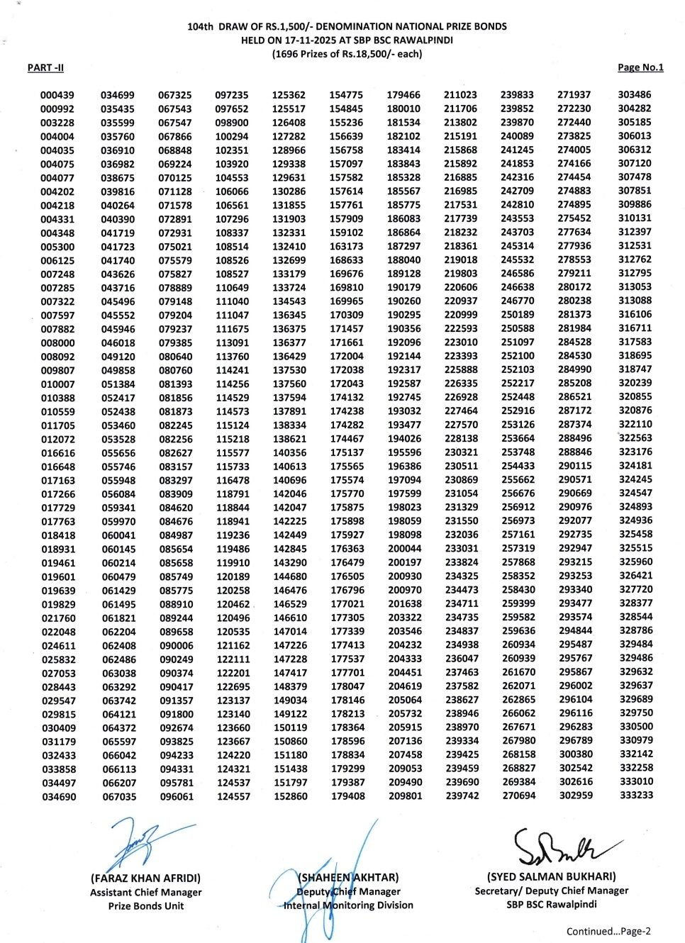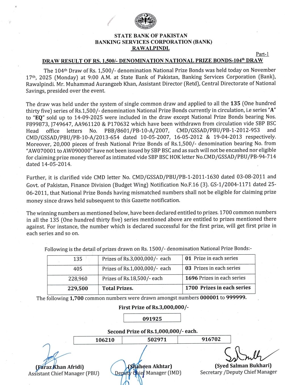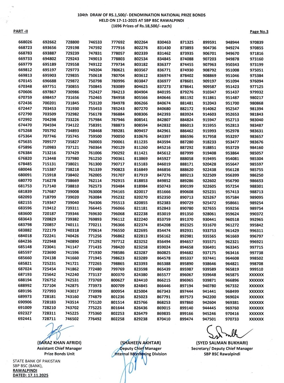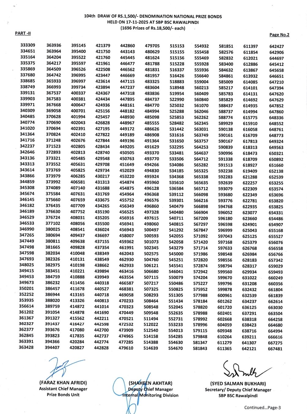 • Prize bond list 1500 draw 104