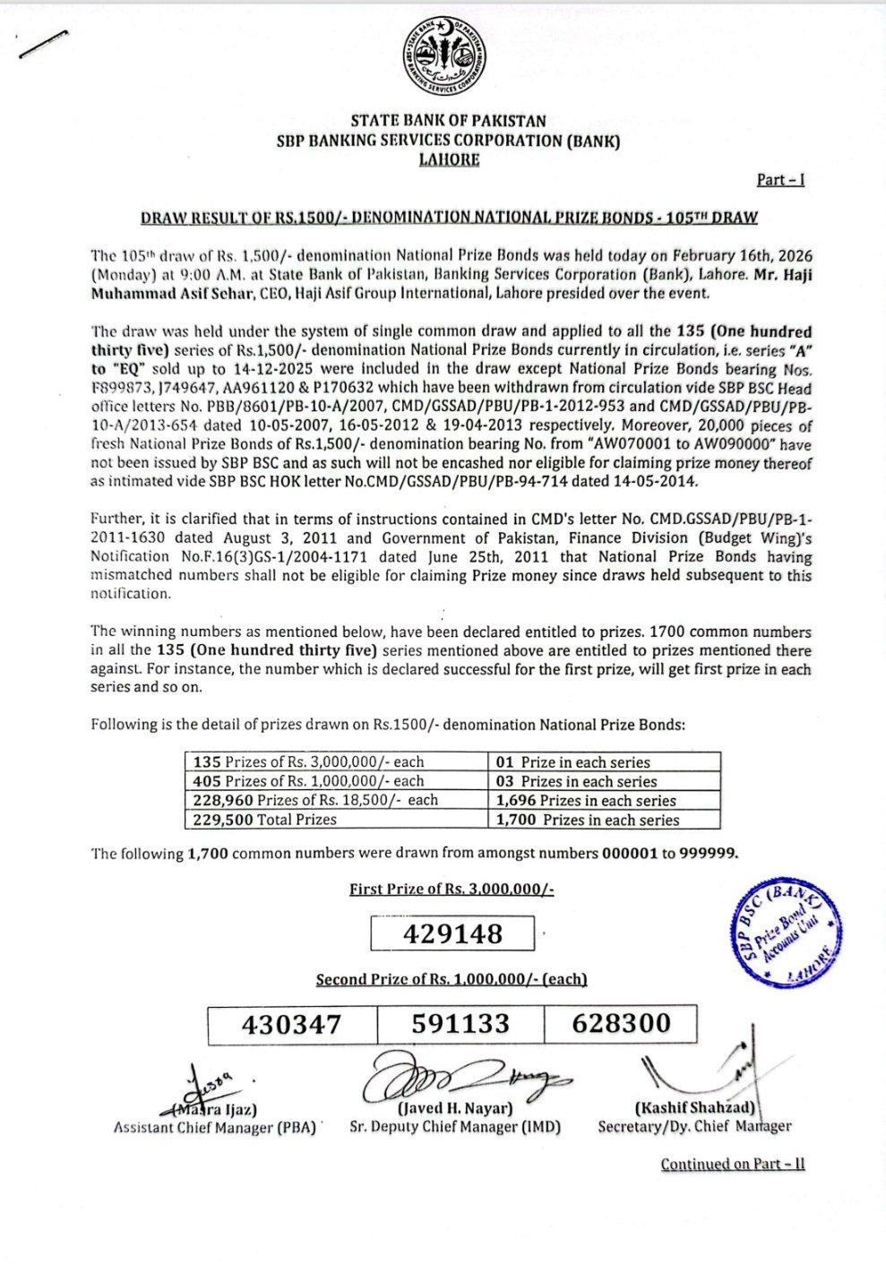 🏆 1500 Prize Bond Draw #105 Result – Lahore (16 Feb 2026)