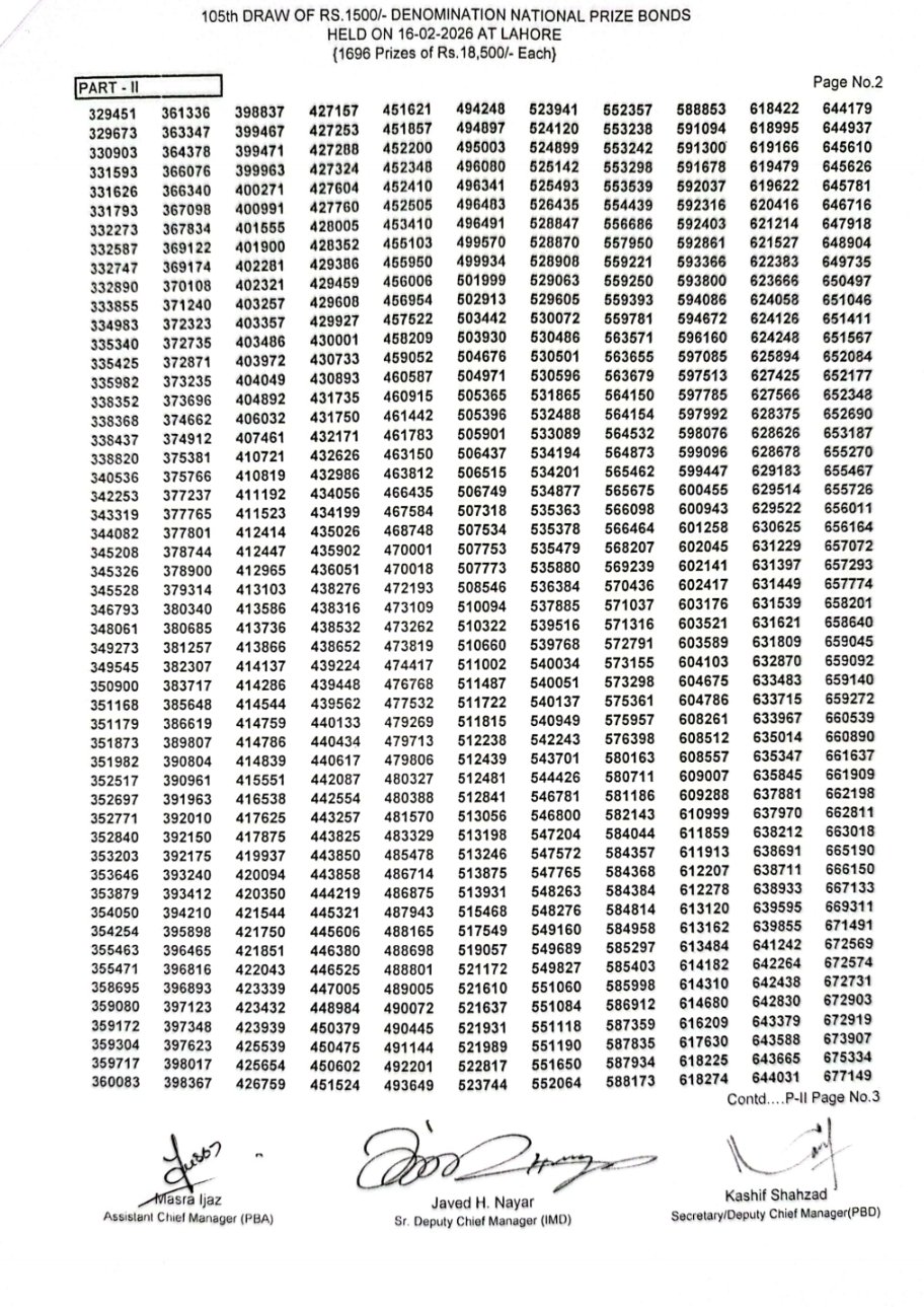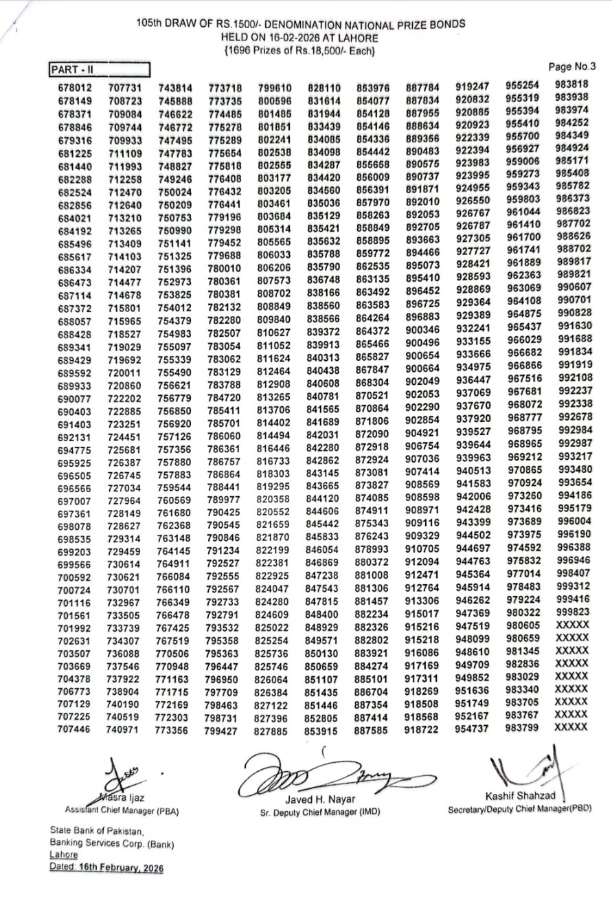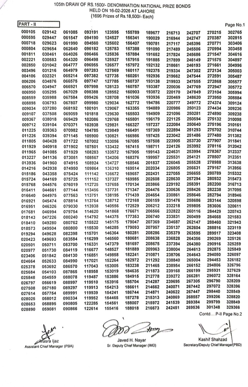 The 1500 prize bond draw #105 was conducted by the Central Directorate of National Savings (CDNS) on Monday, 16 February 2026, at Lahore. This denomination remains one of the most popular prize bonds in Pakistan due to its high first prize and regular quarterly draws.