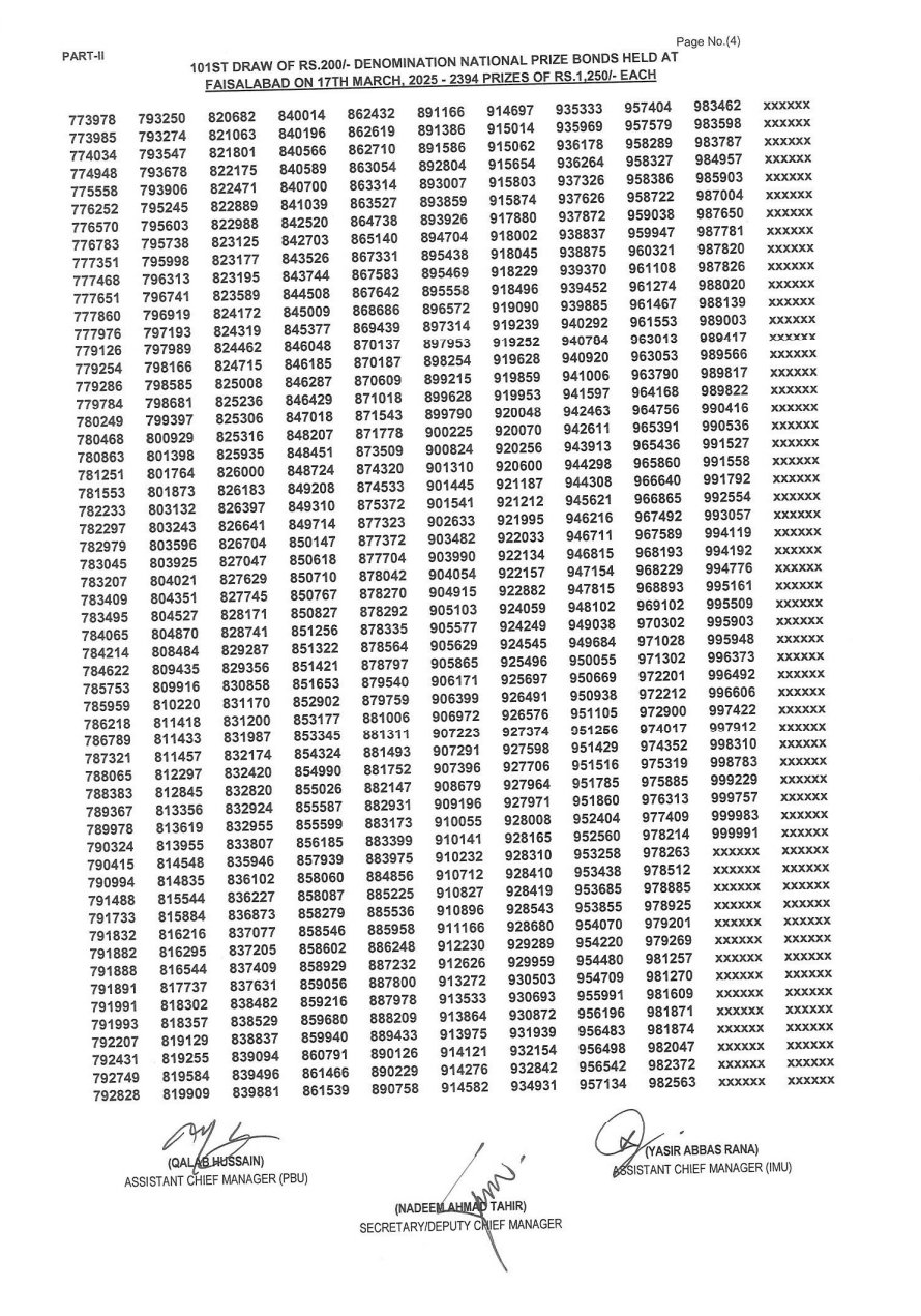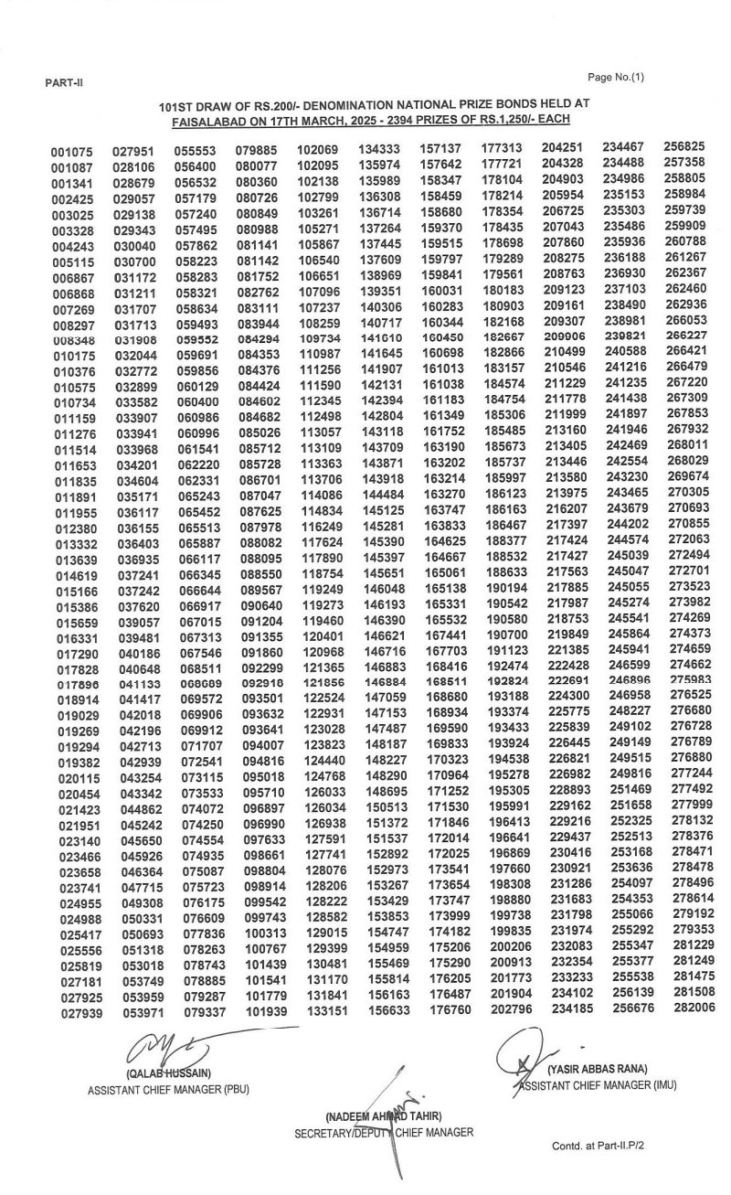 200 Prize Bond List 2025—Draw No. 101 on March 17, 2025, in Faisalabad