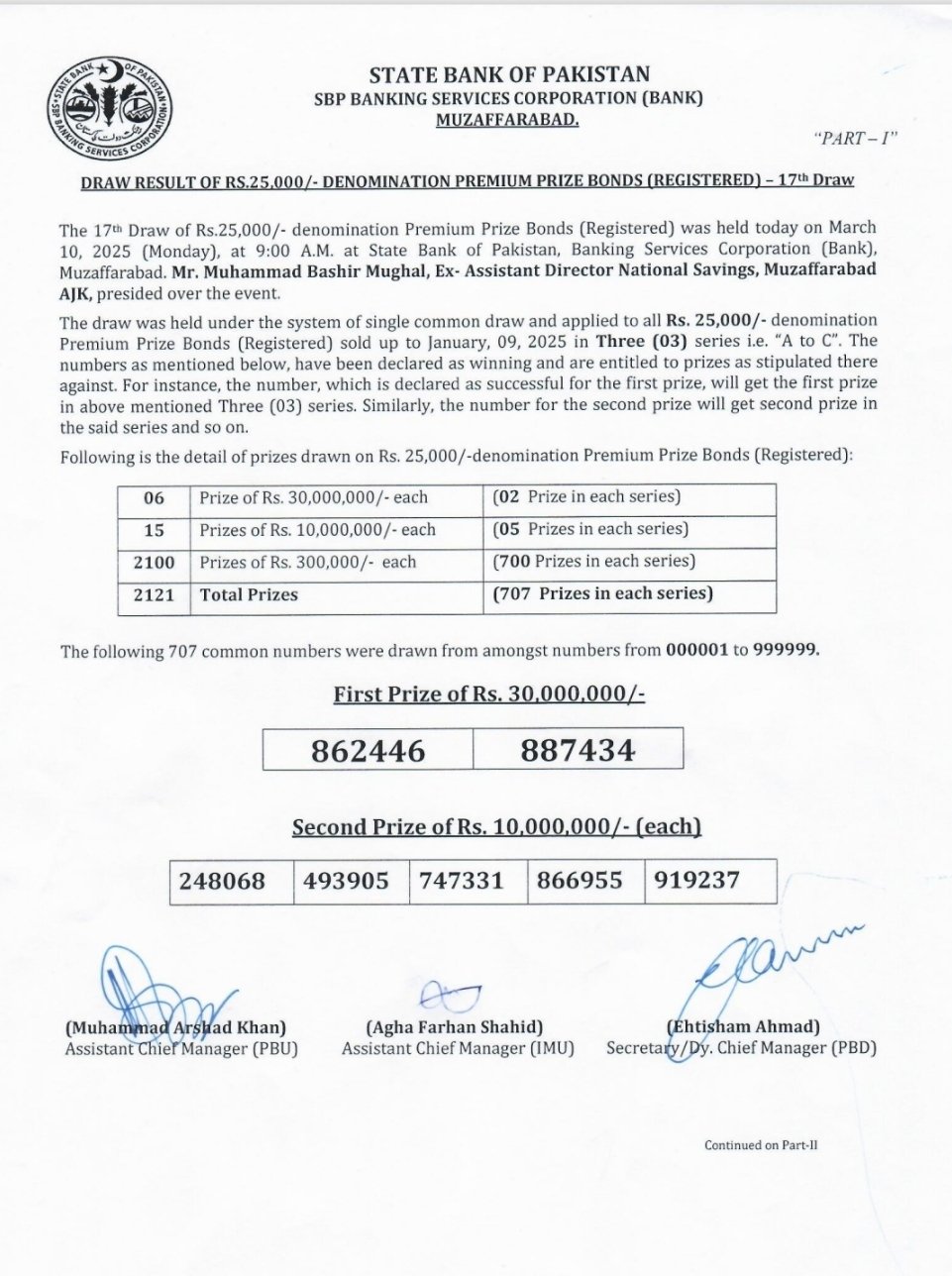 25,000 Premium Prize Bond Draw—March 10, 2025 (SBP BSC Muzaffarabad)