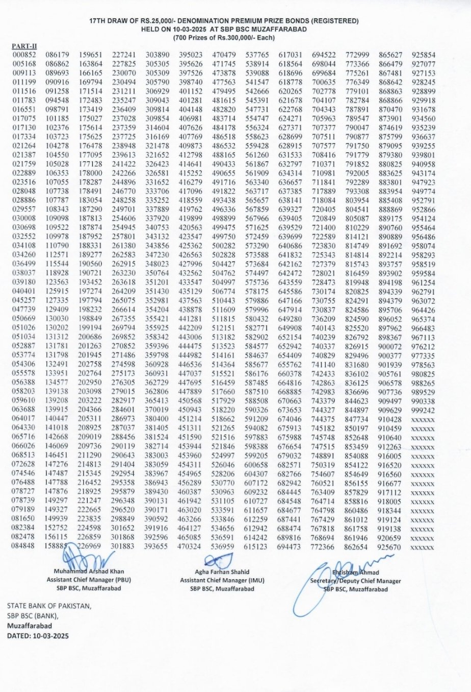 Here are the official winning numbers for the 25,000 Premium Prize Bond Draw #17, held in SBP BSC on March 10, 2025:
