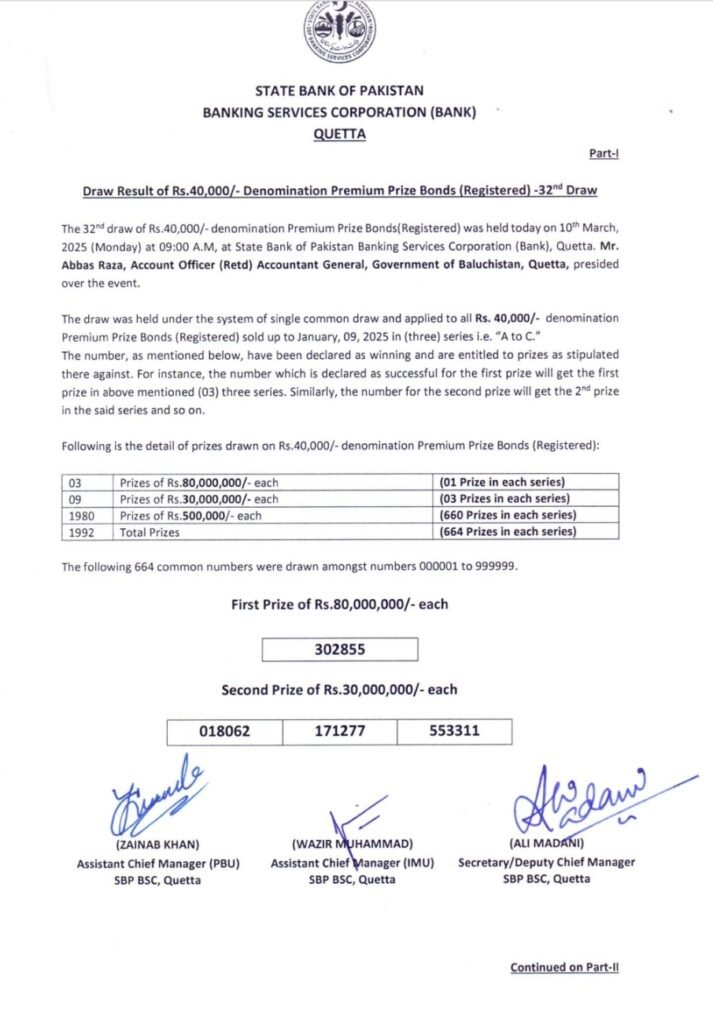 Here are the official winning numbers for the 40,000 Premium Prize Bond Draw #30, held in Quetta on March 10, 2025: