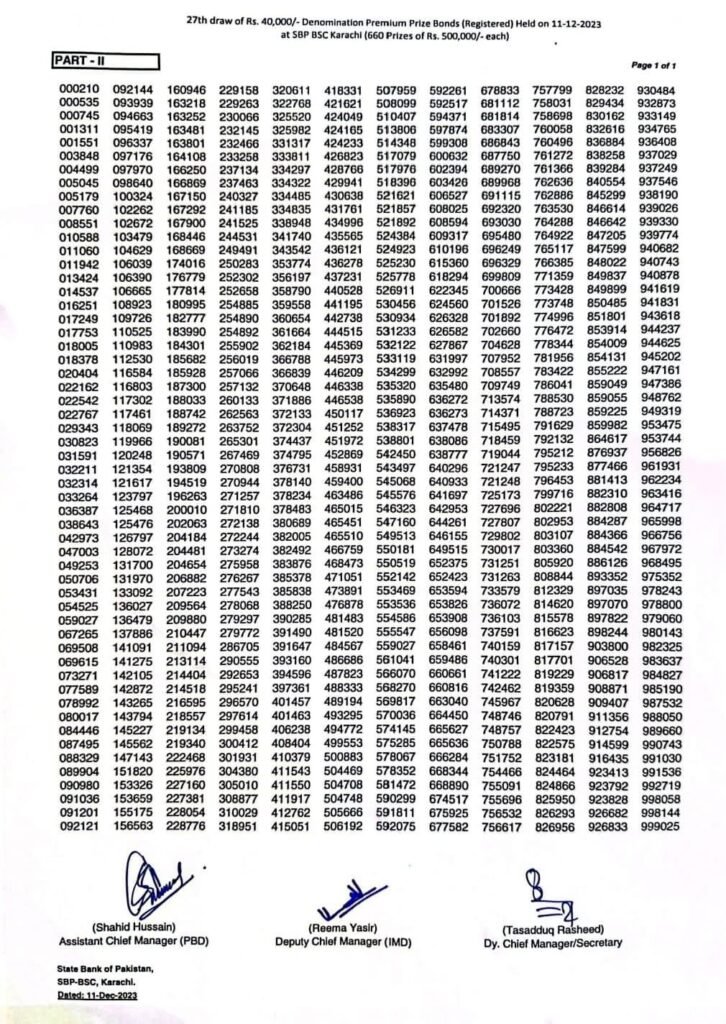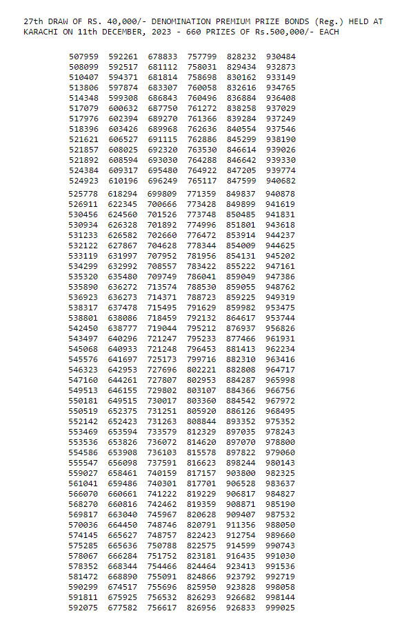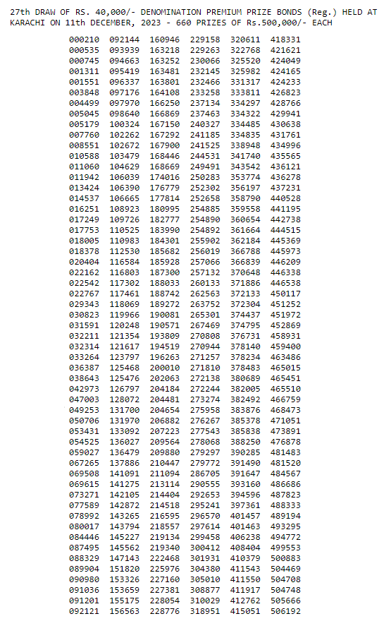 27th Draw Result of Rs. 40000 Denomination of Premium Prize Bonds ( پرائز بانڈ لسٹ 40000 2023)