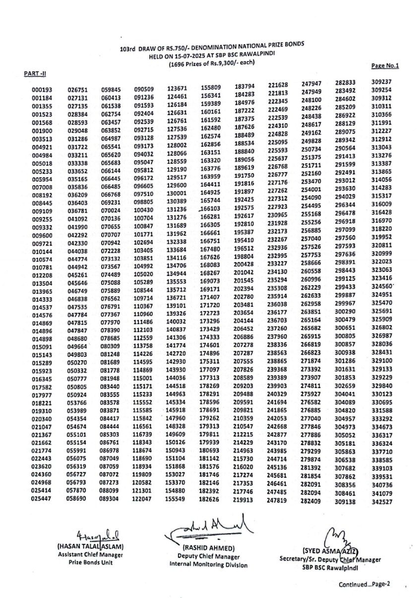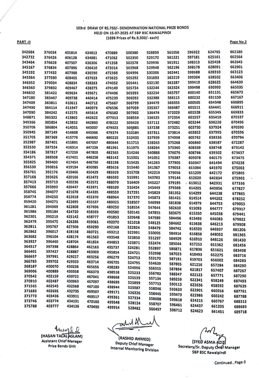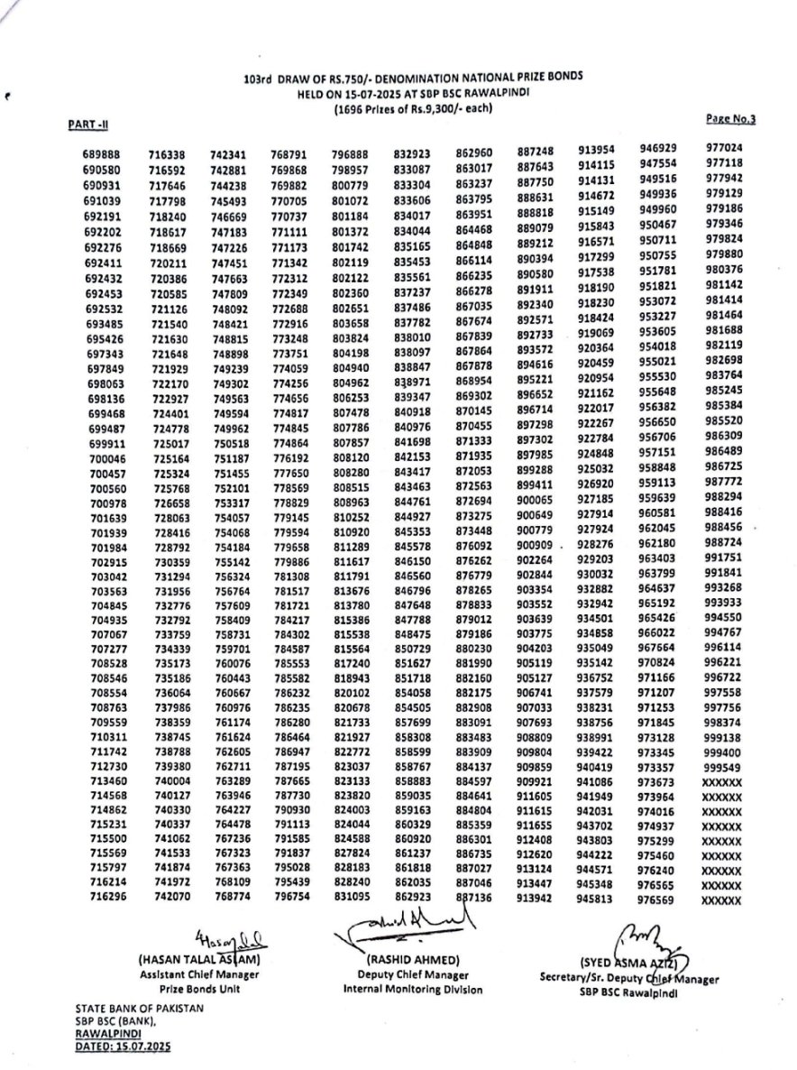 Rs. 1,500 Prize Bond List—Draw No. 103—15 August 2025