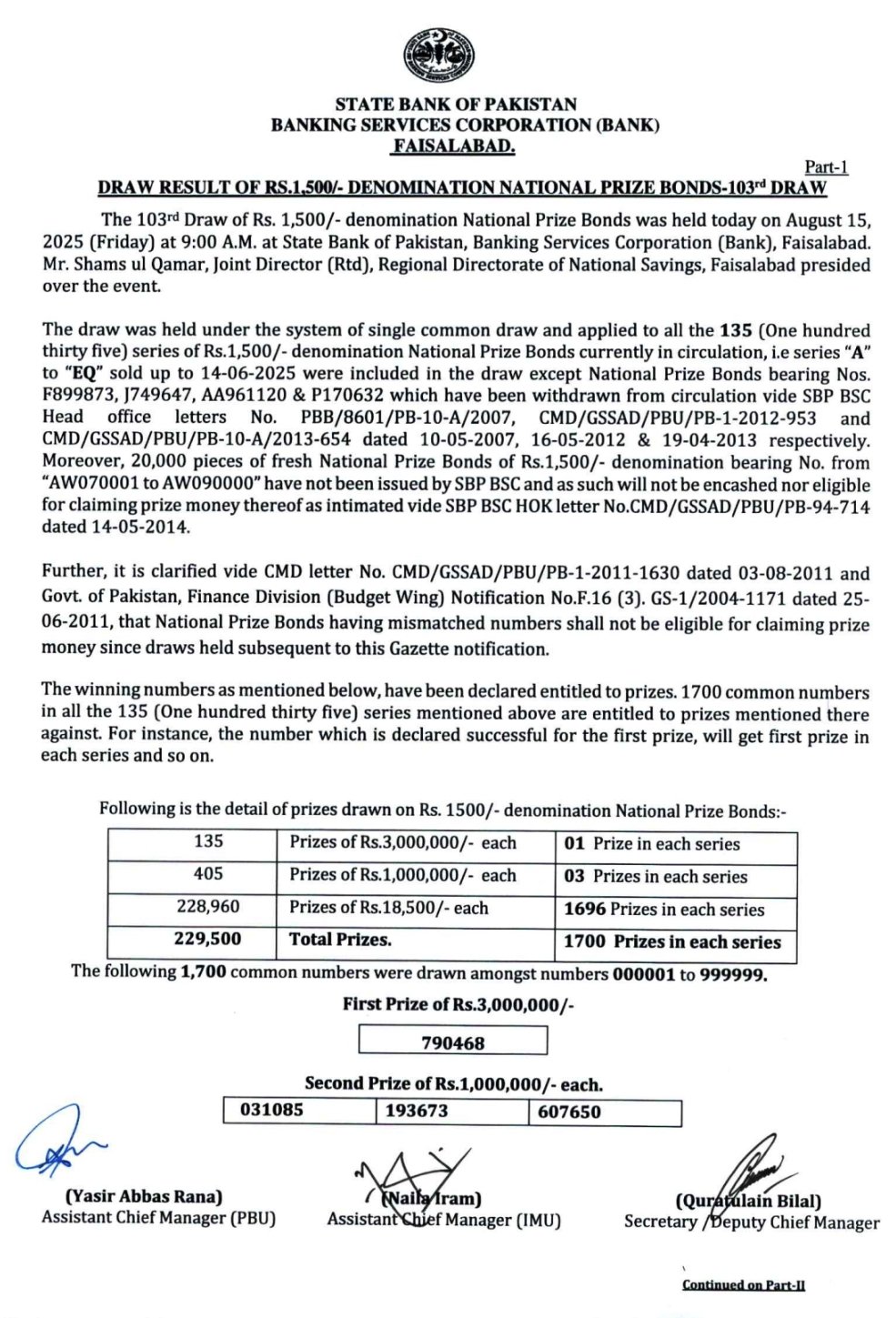 This page covers the Rs. 1,500 prize bond draw (#103) held on 15 August 2025 at SBP BSC Faisalabad. We’ll publish the complete winning numbers below once the State Bank of Pakistan releases the official list.